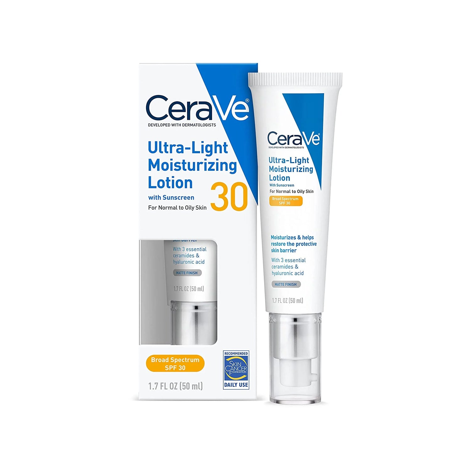 CeraVe Ultra-Light Moisturizing Lotion for normal to oily skin includes broad spectrum SPF 30 sunscreen to help protect skin from sun damage, which can lead to premature signs of aging and skin cancer (when used as directed with other sun protection measures) plus hyaluronic acid and three essential ceramides to hydrate and help restore the skin’s barrier all while leaving a matte finish.