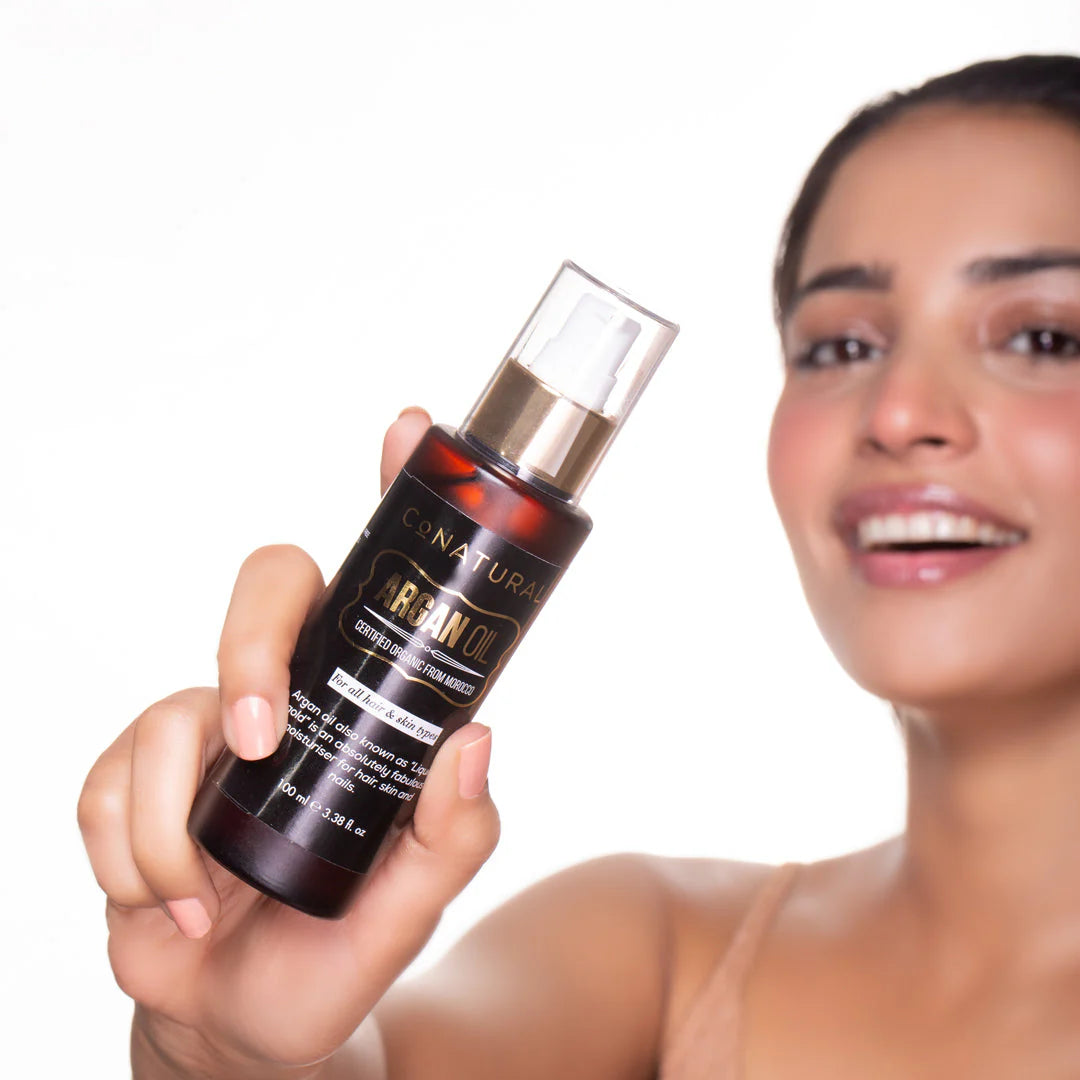 Enhance your beauty routine with CoNatural - Argan Oil From Morocco for Skin, Hair, Lips & Nails. This pure, certified organic argan oil is rich in Vitamin E, delivering a luxurious touch to your skin, hair, lips, and nails for a vibrant, youthful appearance. Use it as a night-time moisturizer, in your double cleansing routine, or as a daily hydrating treatment. Gently massage it to deeply nourish, repair, and revitalize. Experience softer, healthier, and more radiant skin and hair with every application.