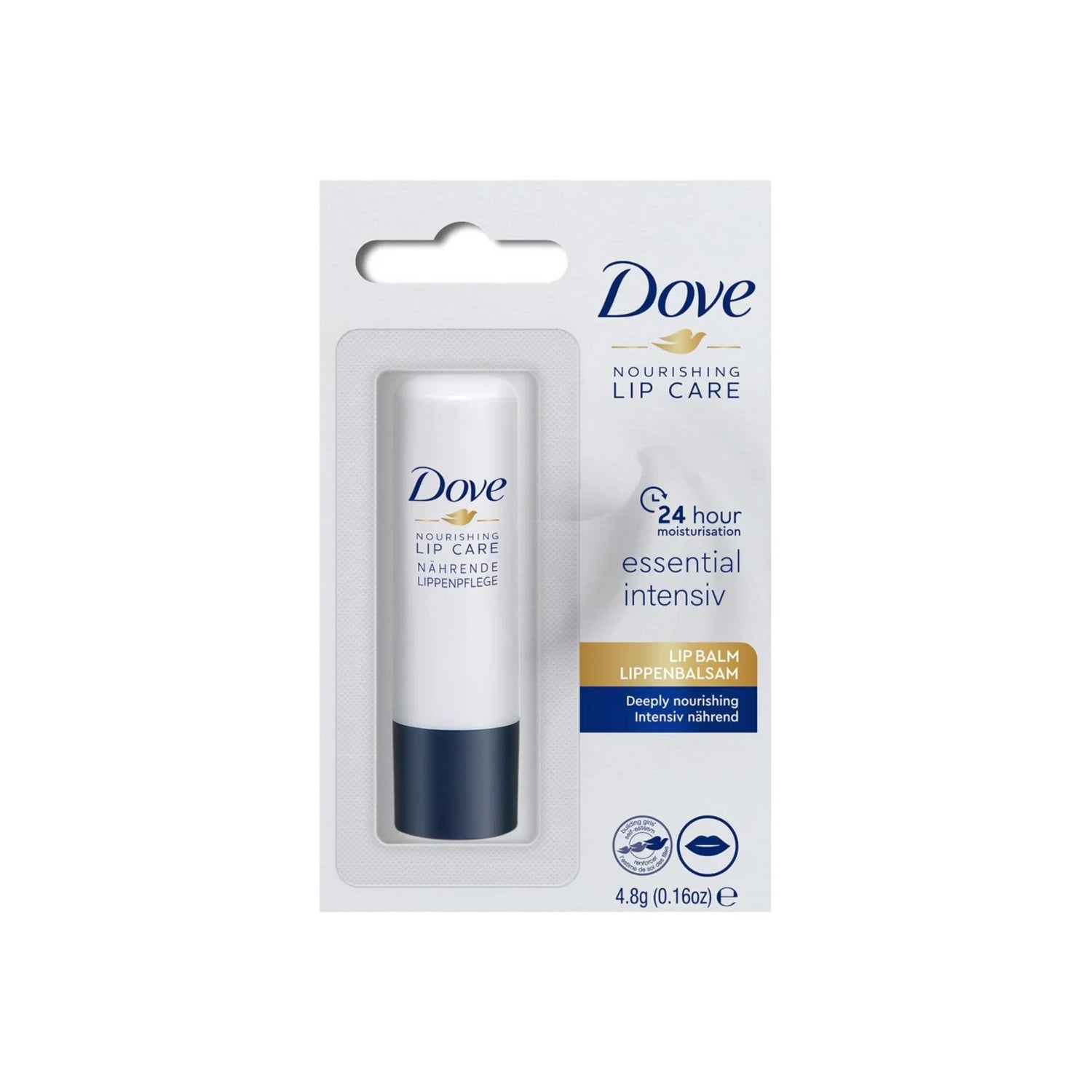Introducing Dove Nourishing Lip Care Essential Lip Balm. Formulated with shea butter and jojoba oil, this long-lasting balm provides 24-hour moisture for dry, cracked lips. Its soft, creamy texture soothes, protects, and repairs for everyday use. Keep your lips nourished and healthy with Dove.