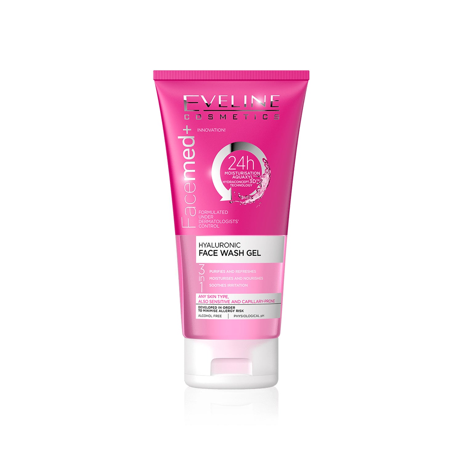 Eveline's FaceMed+ Hyaluronic Face Wash Gel is a unique formula enriched with D-panthenol and allantoin, developed with the expertise of a dermatologist. Suitable for all skin types, including sensitive and capillaries, this 3-in-1 gel effectively removes impurities and makeup, deeply moisturizes and revitalizes, and soothes skin irritations. With Hydraconcept 3D technology and hyaluronic acid, it provides optimal hydration and a healthy, radiant complexion.