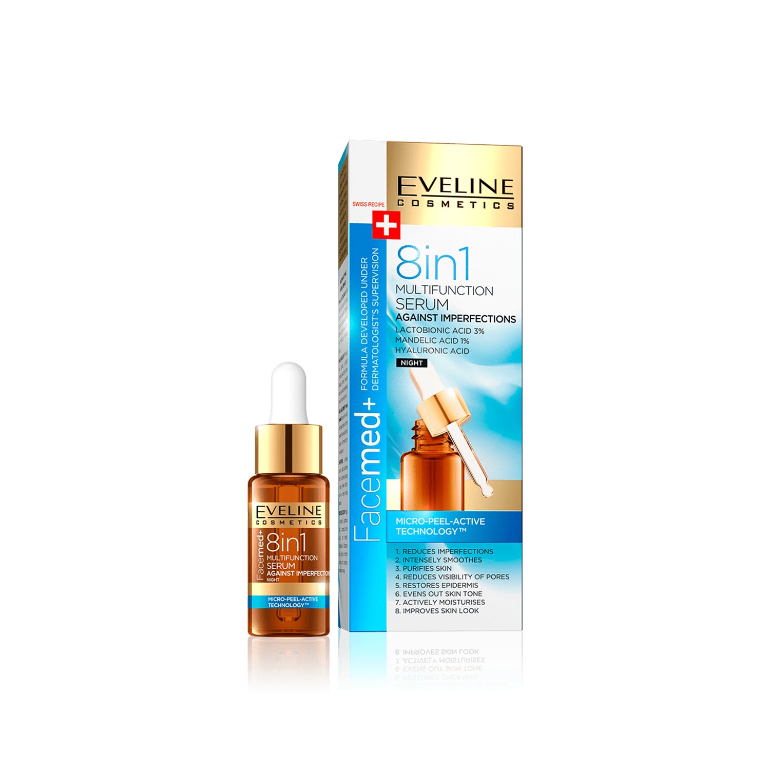 Experience the powerful effects of Eveline's Facemed+ 8-In-1 Multifunction Night Serum. With a unique blend of lactobionic and mandelic acids, this serum gently exfoliates and reduces skin lesions, revealing a renewed and even complexion after just one use.
