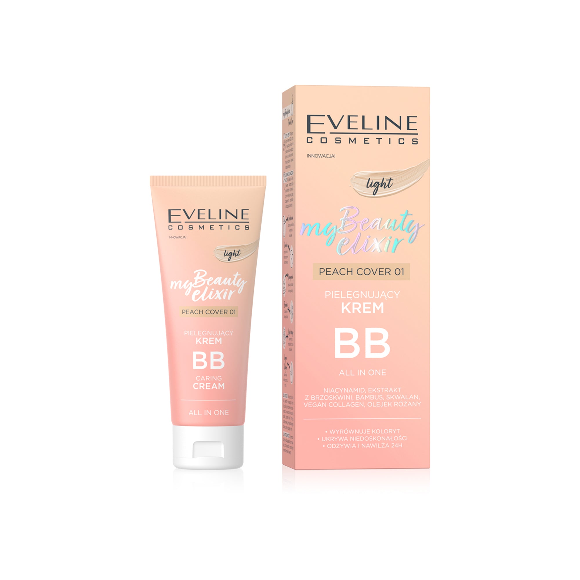 Eveline's My Beauty Elixir Nourishing BB Cream All In One in Peach Cover 01 is designed to provide a natural, radiant finish with skincare benefits. This BB cream aims to offer sheer to light coverage, evening out skin tone and blurring imperfections while hydrating and nourishing the skin.