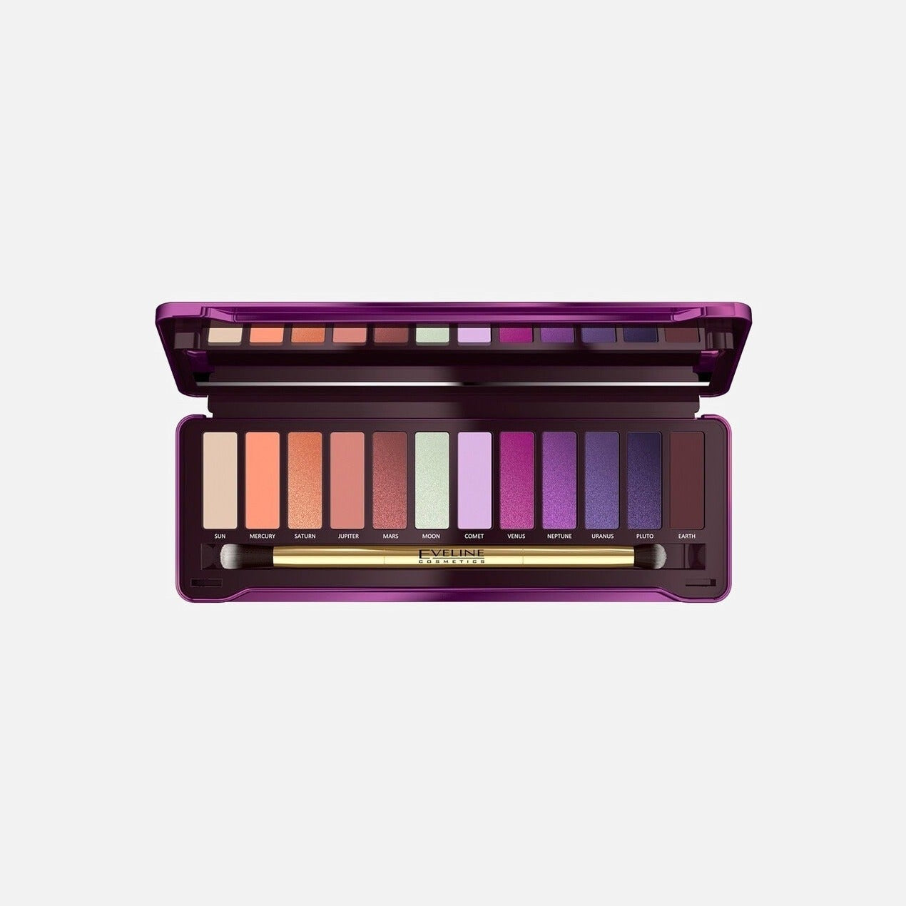 The Eveline Mystic Galaxy Eyeshadow Palette is designed to offer a range of celestial-inspired shades, likely featuring a mix of vibrant and ethereal colors. It aims to provide a combination of matte, shimmer, and potentially glitter finishes, allowing for diverse eye looks from subtle to bold.