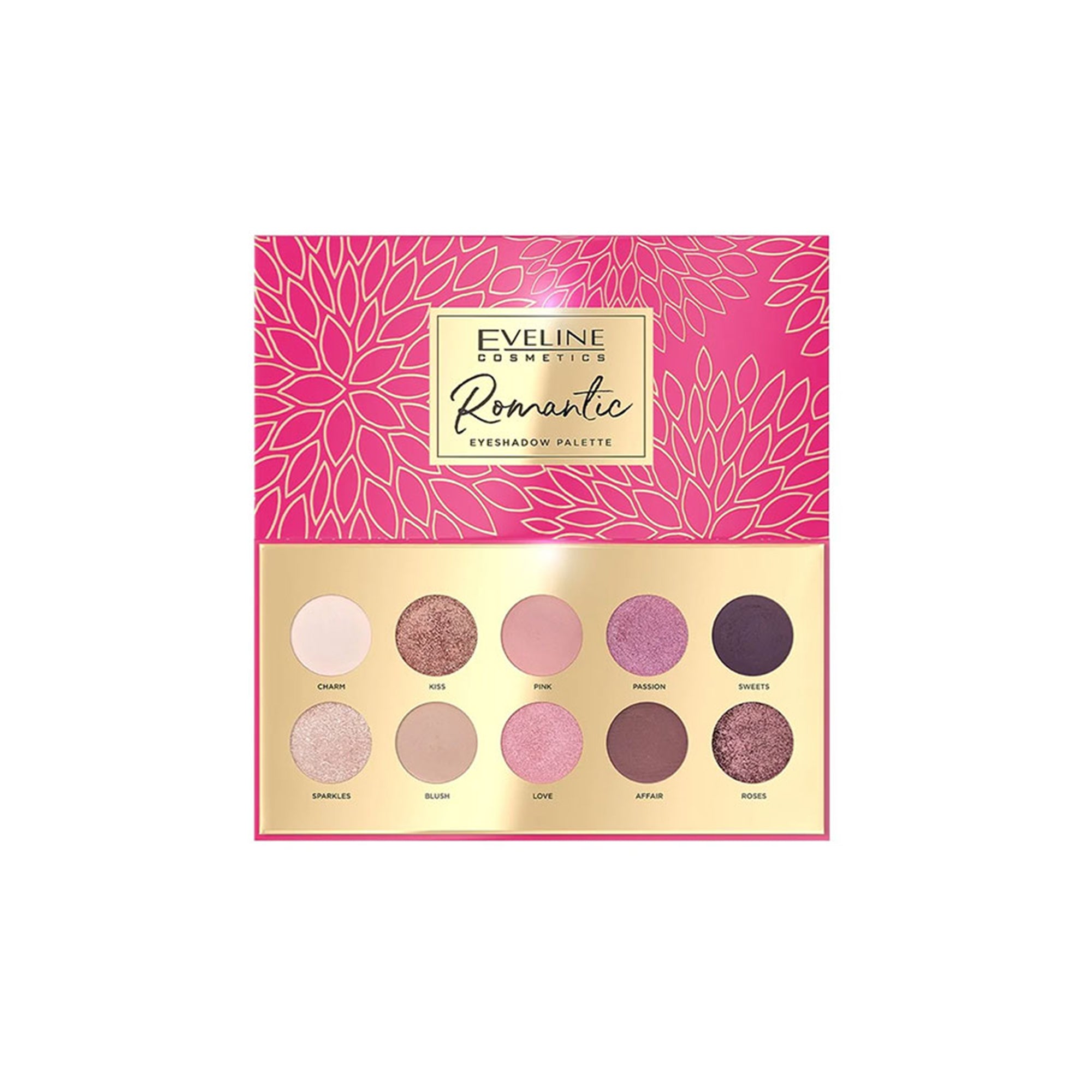 The Eveline Romantic Eyeshadow Palette, featuring 10 shades, is designed to evoke a soft, dreamy aesthetic. It aims to offer a selection of complementary colors, likely including pinks, purples, and neutral tones, with a mix of matte and shimmer finishes.