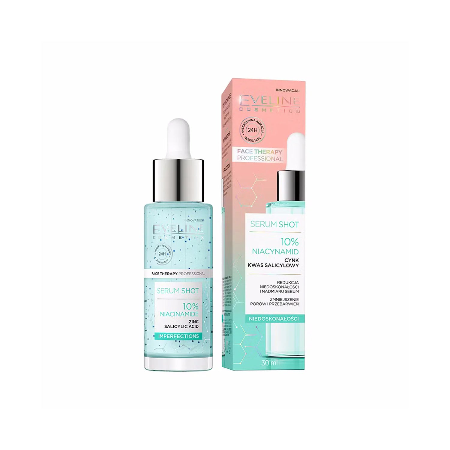 Eveline - Serum Shot 10% Niacinamide Zinc is a FACE THERAPY PROFESSIONAL treatment specially designed for oily and combination skin with visible blackheads, dilated pores, and acne blemishes. With 10% niacinamide, zinc, and salicylic acid, this serum effectively reduces imperfections and pore visibility, revealing a cleaner, clearer complexion. In fact, after just 4 weeks of use, 90% of users noticed a reduction in visible imperfections.*