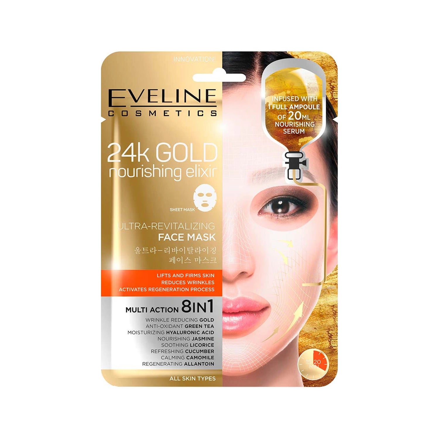 Transform your skin with Eveline's 24K Gold Nourishing Elixir Face Mask. This ultra-revitalizing Korean sheet mask is infused with a nourishing serum that lifts and firms your skin. In just one use, your skin will appear smoother, brighter, and wrinkles will be less noticeable. Say hello to radiant, youthful-looking skin.