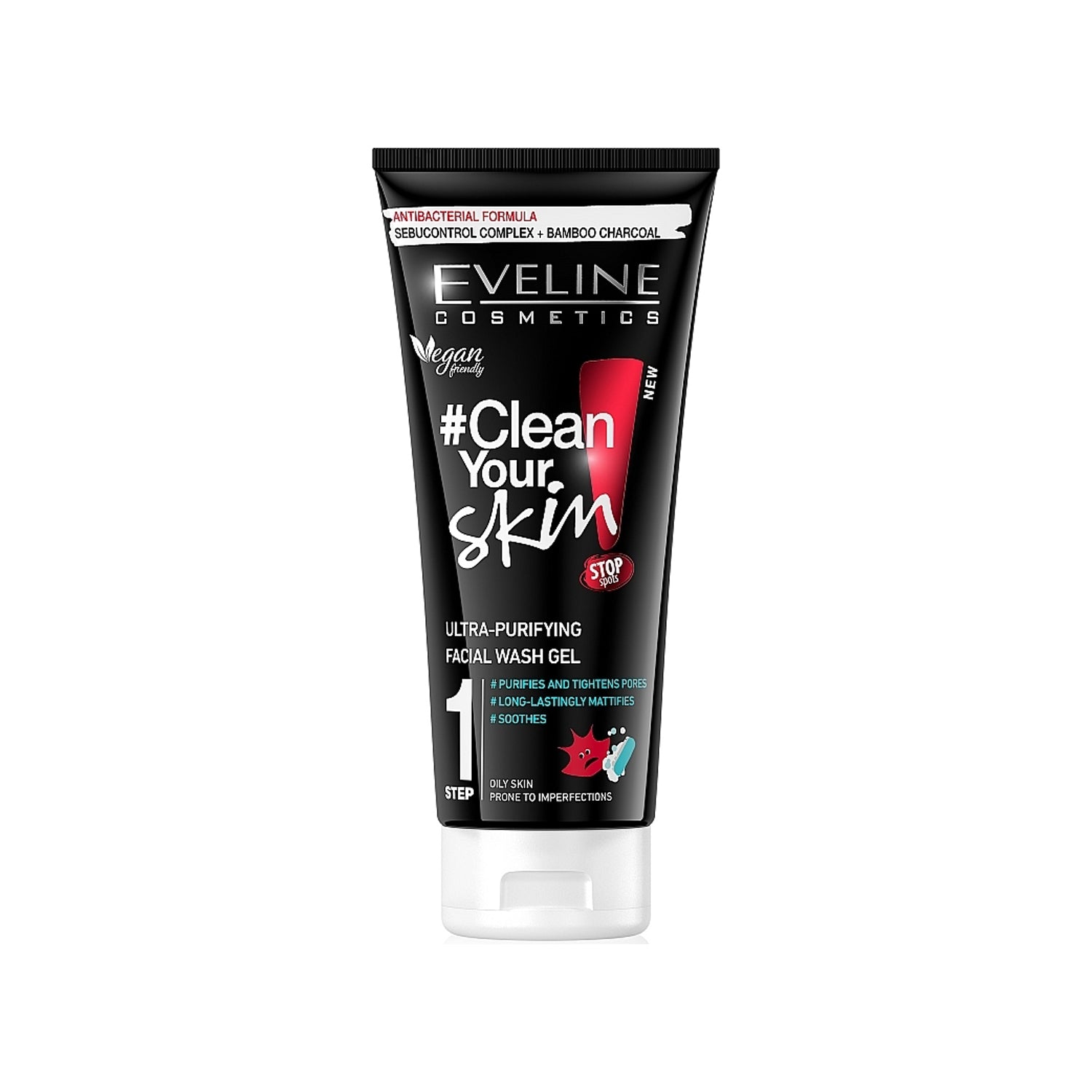 Eveline Clean Your Skin STEP 1 Ultra Purifying Facial Wash Gel deeply purifies the skin, effectively reducing excess sebum, removing impurities, and eliminating makeup residues for a refreshing, clean feeling. Infused with bamboo charcoal, this gel unblocks and tightens pores, reduces redness, and controls unwanted shine. Its unique complex penetrates deep into the epidermis, helping prevent imperfections and leaving your complexion smoother and healthier. Ideal for achieving a clearer, mattified appearance with every use.