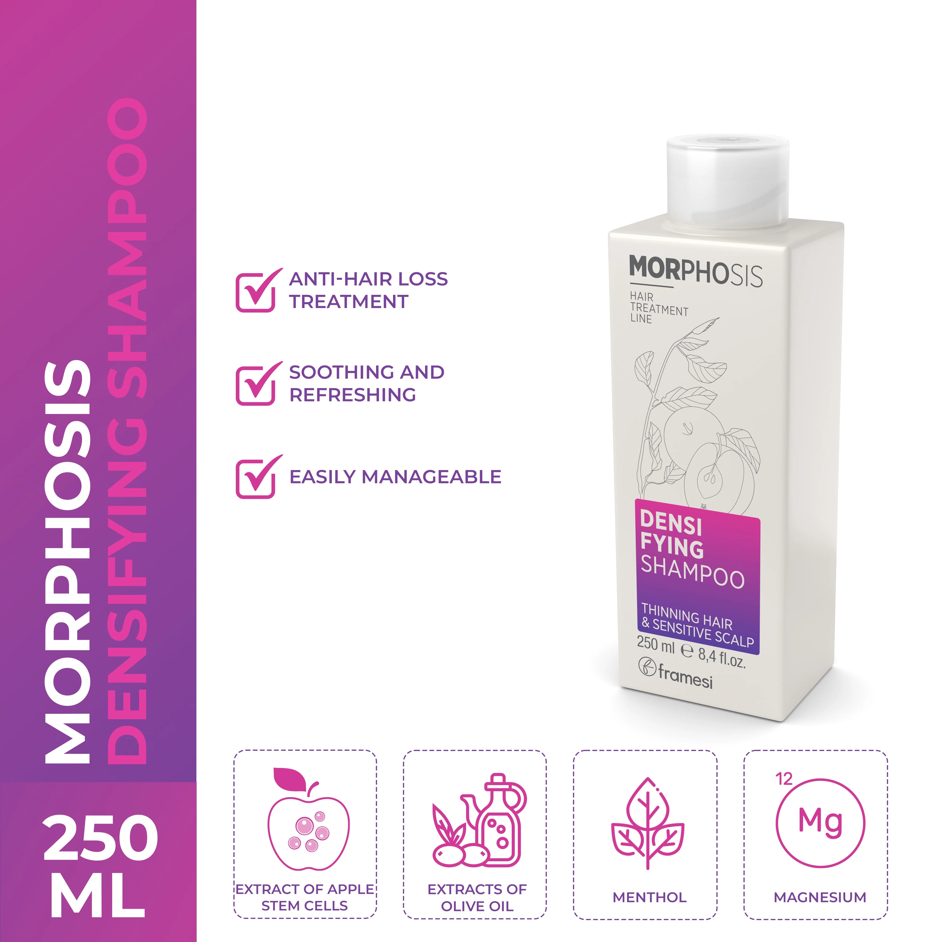 Enhance hair density and prevent hair loss with Framesi - Morphosis Densifying Shampoo. Scientifically proven to cleanse the scalp's hydrolipid barrier, it leaves hair soft and shiny for both men and women. A must-have for your anti-hair loss treatment regimen.