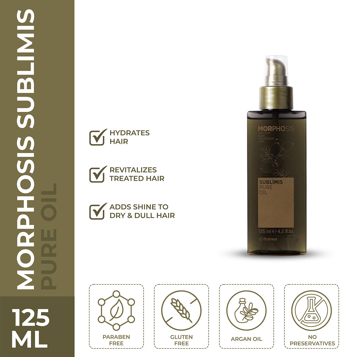 Achieve healthy, glossy hair with Framesi Morphosis Sublimis Pure Oil. Infused with nourishing argan oil, this lightweight formula provides shine, softness, and prevents dryness. Easy to apply and wash out, it works best when used on towel-dried hair. This oil deeply nourishes, leaving your hair soft and manageable. Perfect for anyone looking to add shine and improve hair health.