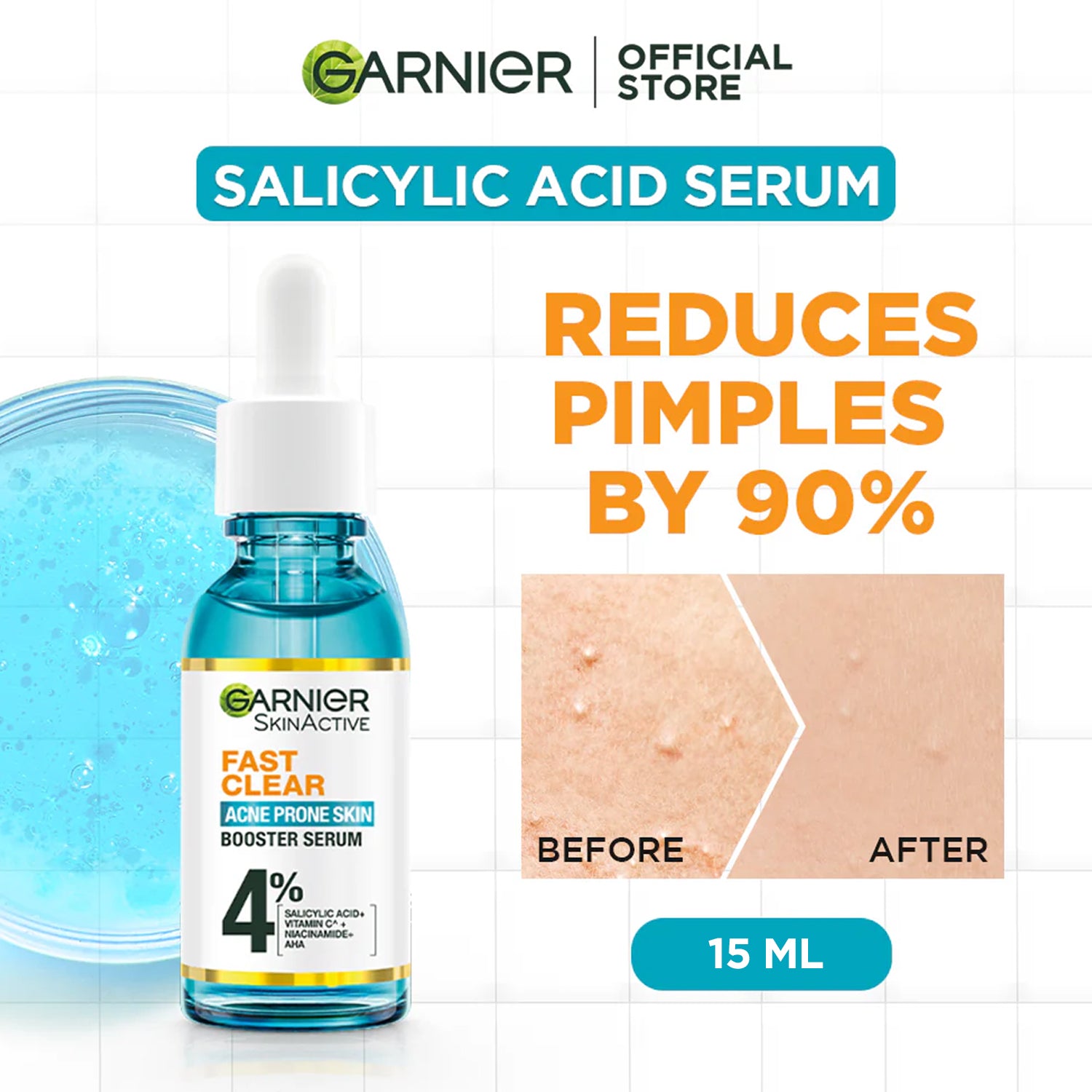 Achieve clear and bright skin with Garnier Anti Acne Serum 15ml. Infused with salicylic acid, this serum effectively fights acne by unclogging pores and removing impurities. With added Vitamin C and E, it also improves skin tone and fades acne scars for a radiant complexion.