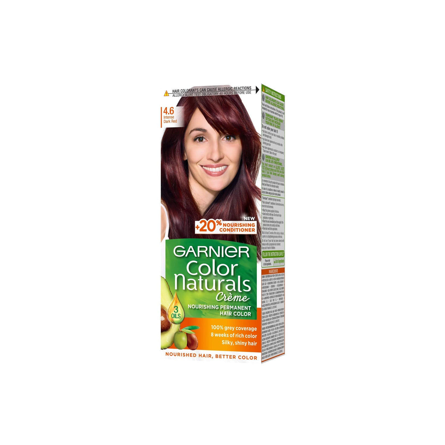 Get intense dark red hair with Garnier Color Naturals Creme. Enriched with Olive oil, this permanent color cream nourishes and strengthens hair for a richer, more uniform, and shinier result. With a second ratio of olive oil in the conditioner, your hair will be deeply treated and radiant. No more grey hair with this real hair color treatment.