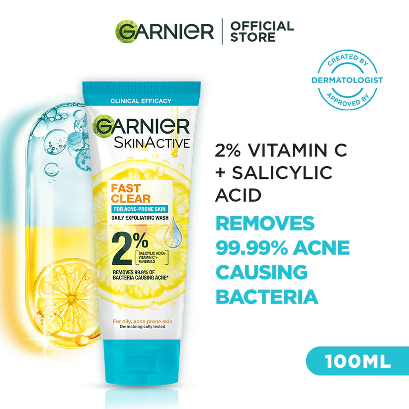 Garnier Skin Active Fast Clear Face Wash is specially formulated for acne-prone skin, offering a fast-acting solution to help reduce pimples, unclog pores, and improve skin clarity. Its effective formula deeply cleanses to remove dirt, excess oil, and acne-causing impurities, leaving your skin feeling fresh, smooth, and clear.