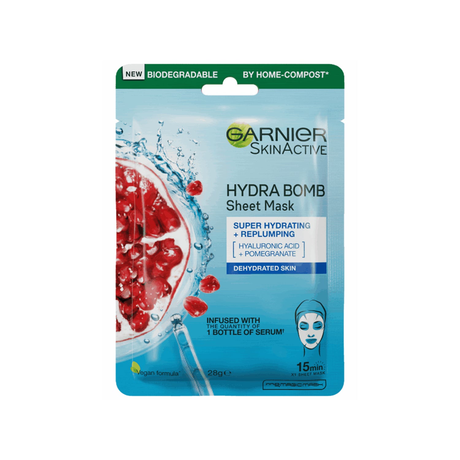 Garnier Hydra Bomb Pomegranate Sheet Mask delivers an instant surge of 24-hour moisture in just 15 minutes. Infused with Pomegranate Extract and Hyaluronic Acid, this ultra-thin tissue mask acts like a hydration wrap, leaving skin plump, radiant, and deeply refreshed. Ideal for dull or dehydrated skin, it’s your go-to for a quick, soothing at-home facial. Dermatologically tested and suitable for all skin types.