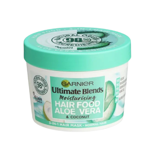 Transform your hangry hair with Garnier Ultimate Blends Aloe Vera Hair Food Mask. Its 3-in-1 formula nourishes and conditions hair, leaving it up to four times shinier. Made with 98% natural ingredients and 100% vegan formula, its super food blend of Aloe Vera and Coconut will revitalize and moisturize your normal to dry hair without weighing it down. Made in Germany.