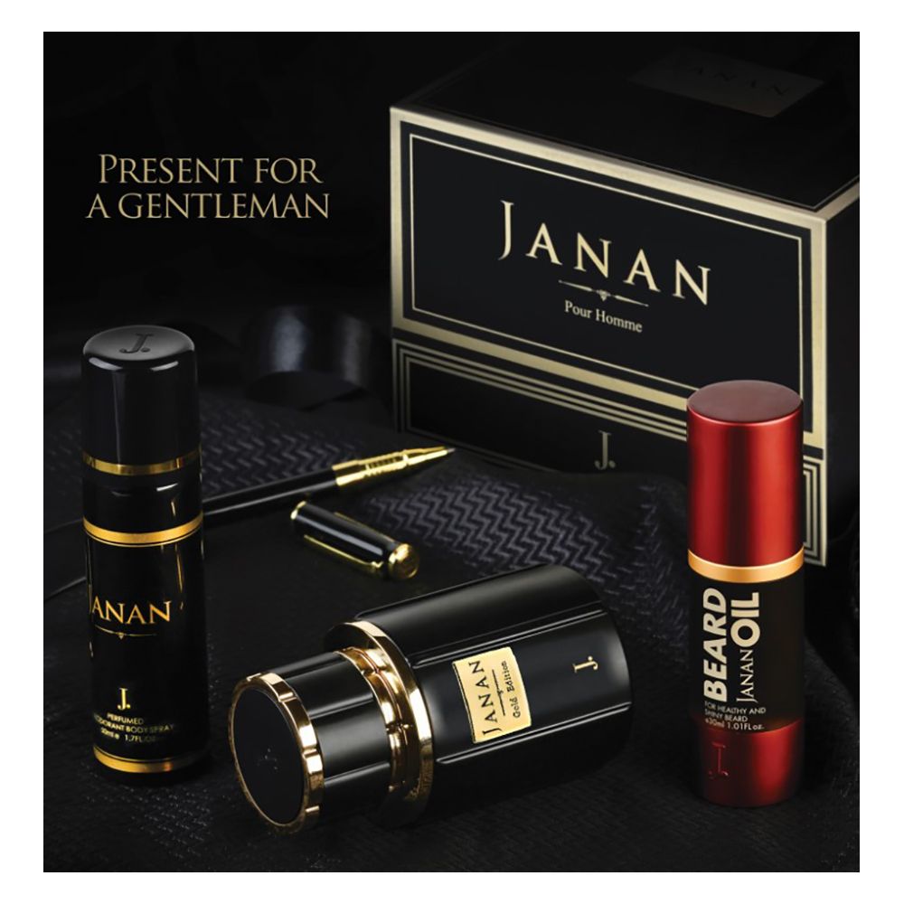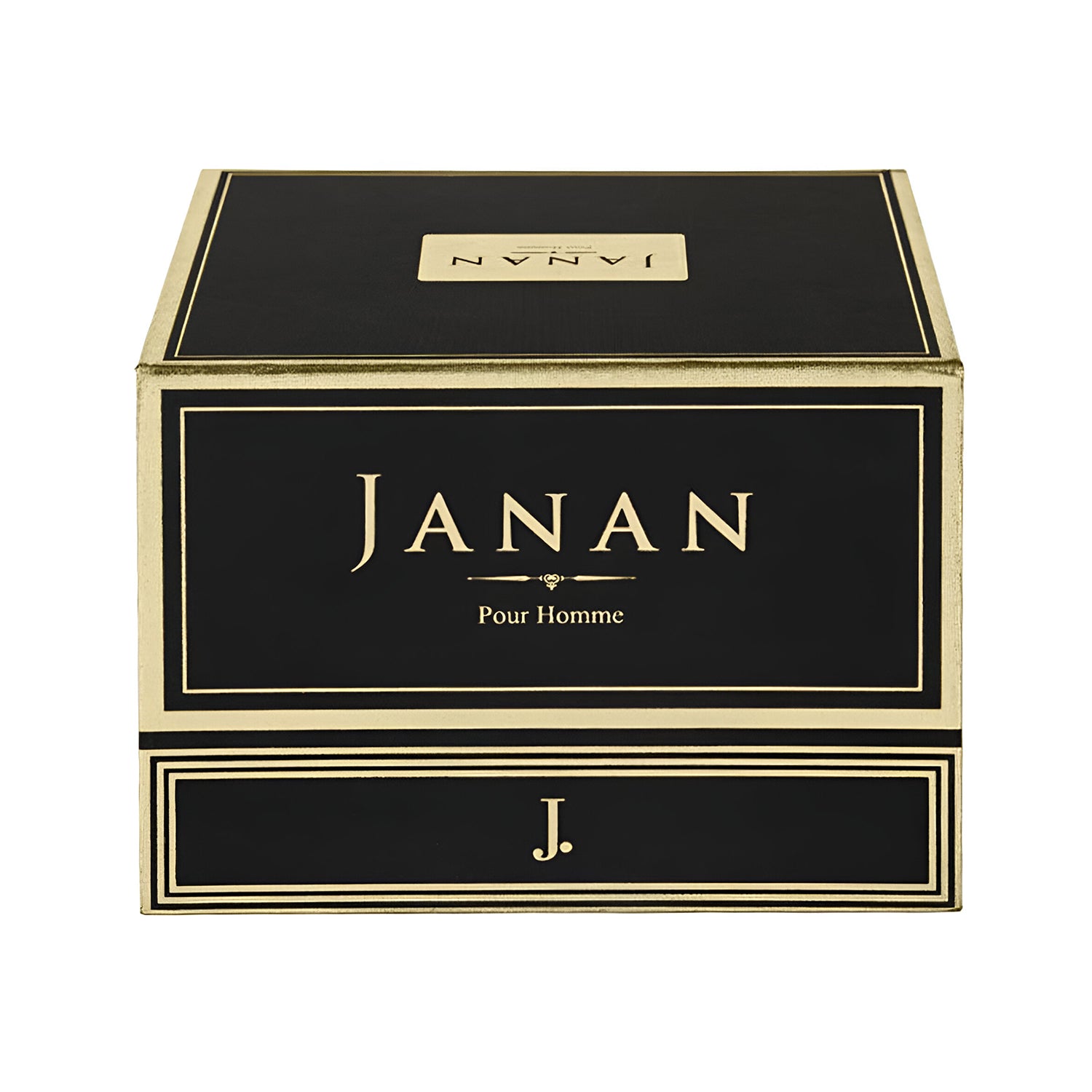 Enhance your grooming routine with the Janan Gold Pour Homme Gift Set by J. Junaid Jamshed, a complete package of elegance and care. This set features the timeless chypre and musk Eau De Parfum, enriched with floral heart notes of jasmine, rose, and birch, delivering a sophisticated and long-lasting fragrance.