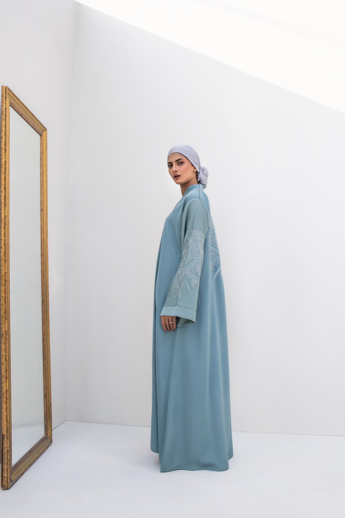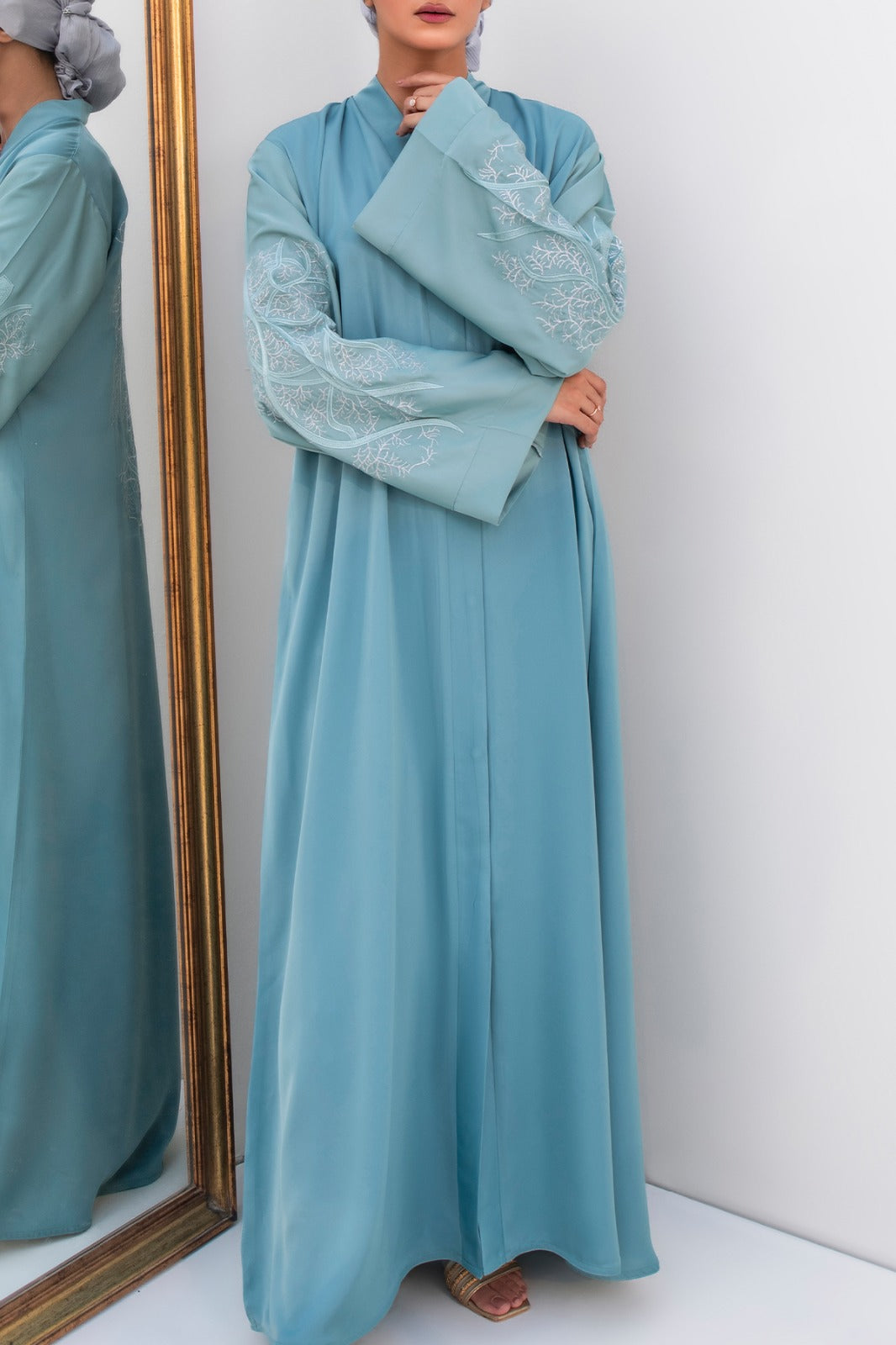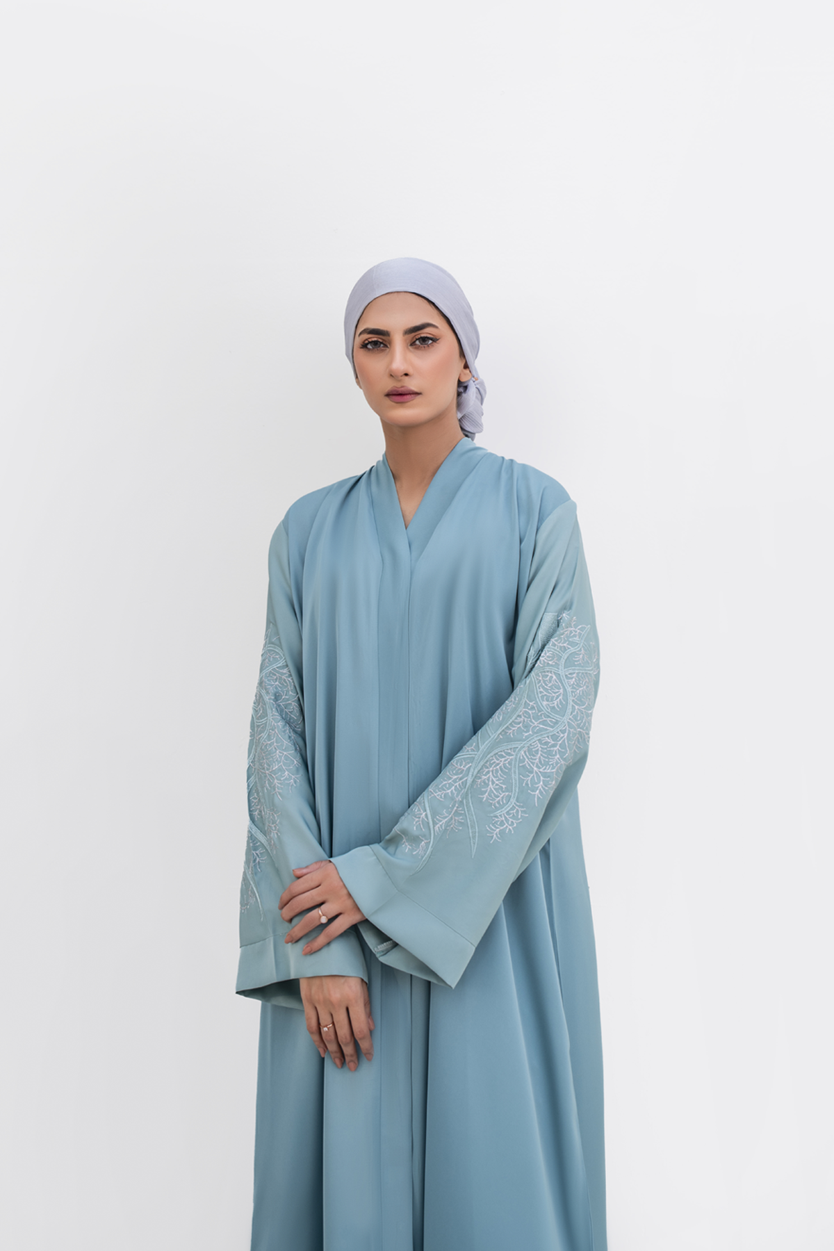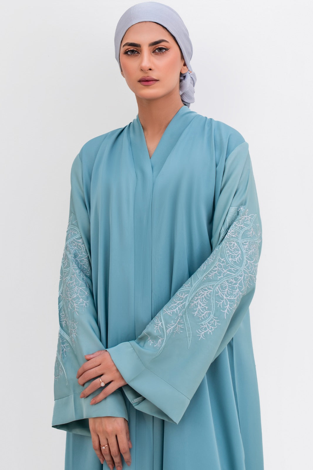 Lina Alsama is a beautiful Abaya in shades of blue on sleeves and body made from imported Nida Fabric, giving it a stunning, glossy shine. It's thoughtfully designed with embroidery work on sleeves and back to maintain its elegant fall and keep the design intact. The front-open, flowy design adds a touch of grace. It’s captivating blend of blue tones on the silk Hijab which is included in the package creates a truly mesmerizing style statement.