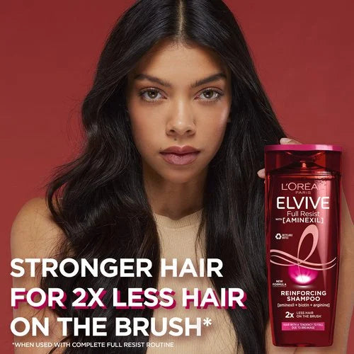 Revive and strengthen your hair with Loreal Elvive Full Resist Aminexil Reinforcing Shampoo. Combat stress, brushing, seasonal changes, and heat styling with this formula enriched with Aminexil to reduce hair fall by 92%.
