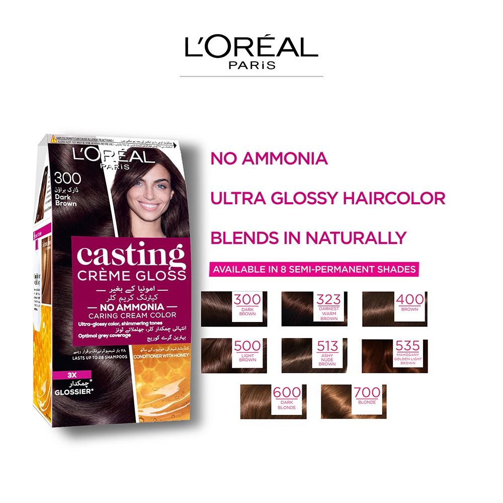 Achieve natural-looking, shimmering hair color with Loreal Paris Casting Hair Color. The no-ammonia crème formula blends away grey hair, lasting up to 28 shampoos. Enriched with Coconut oil, this hair color leaves your brown locks soft, voluptuous, and with a luscious scent. Easy to use, follow instructions for best results.