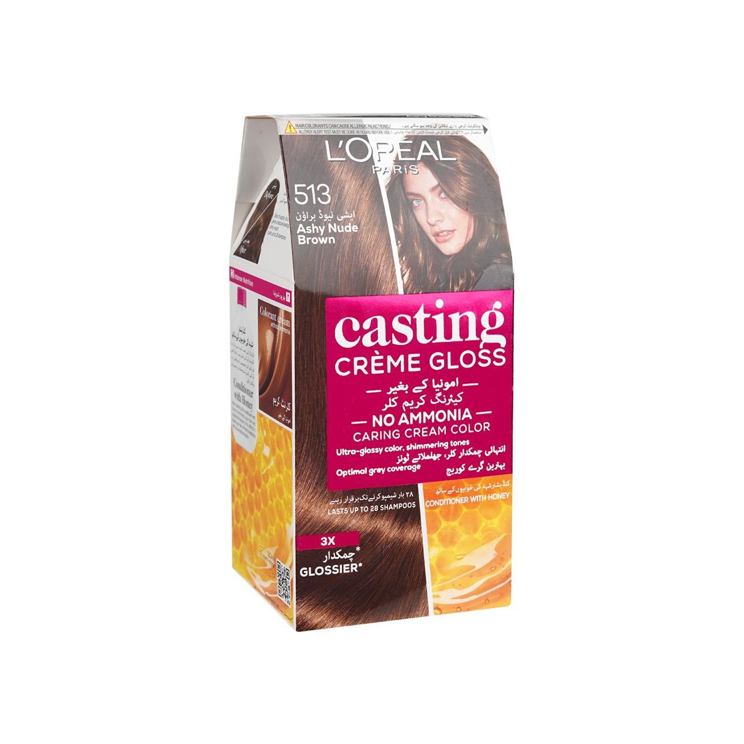 Get a natural and ashy yet nude brown hair color with Loreal Paris' Casting Hair Color in shade 513. Achieve a professional and scientific look with this shade that provides 100% grey coverage. Transform dull and lifeless hair to a rich and vibrant shade with this expertly crafted product.