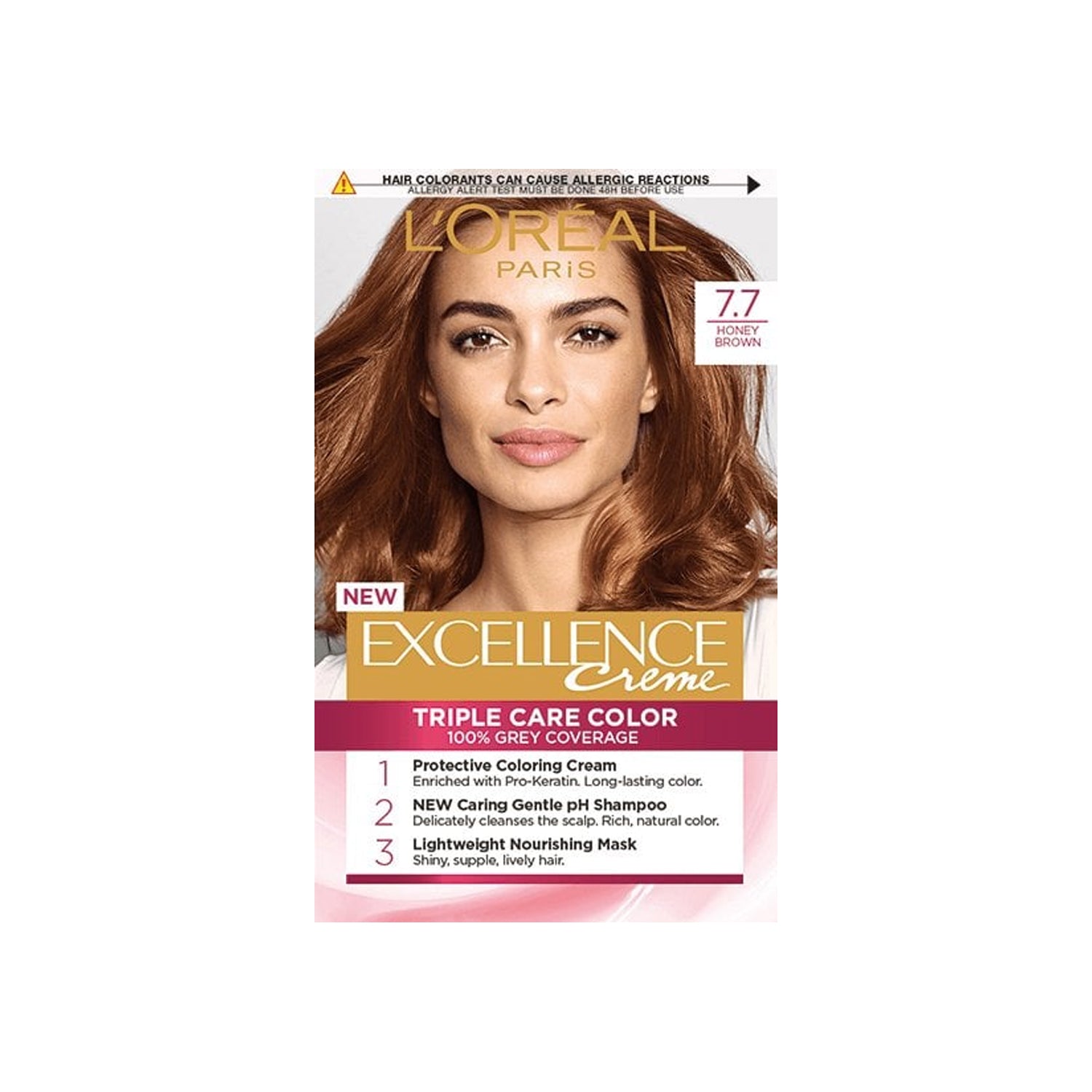 Achieve a beautiful, worry-free hair transformation with Loreal Paris - Excellence Crème Hair Color in 7.7 Honey Brown. With a variety of shades to choose from, our unique formula provides unbeatable shine that lasts, while protecting and coloring your hair. Say goodbye to grays and maintain your flawless look with Excellence by l'Oréal Paris.