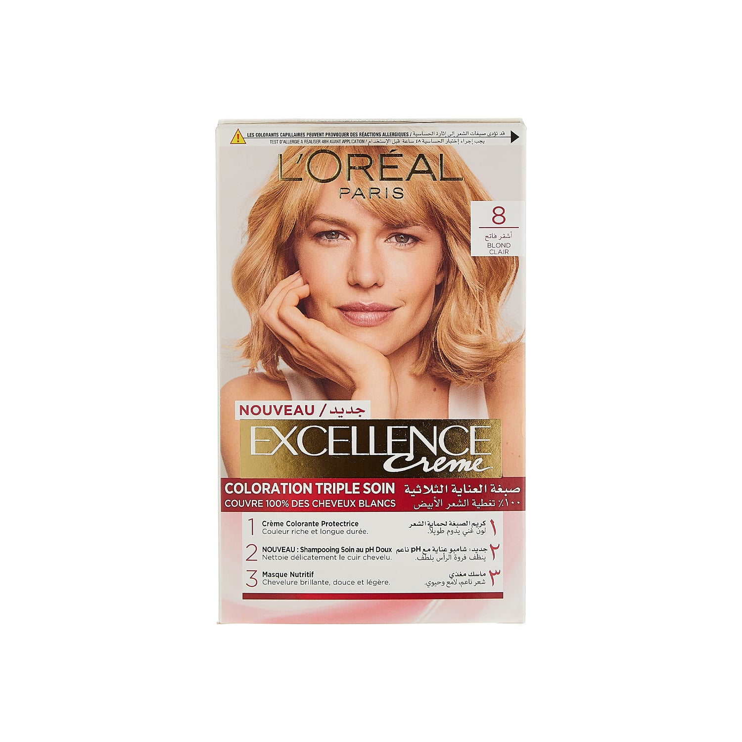 Give your hair a gorgeous makeover with Loreal Paris - Excellence Crème Hair Color in shade 8 Light Blonde. With its advanced formula, achieve vibrant, long-lasting color and 100% grey coverage. Experience silky soft and nourished hair with every use.