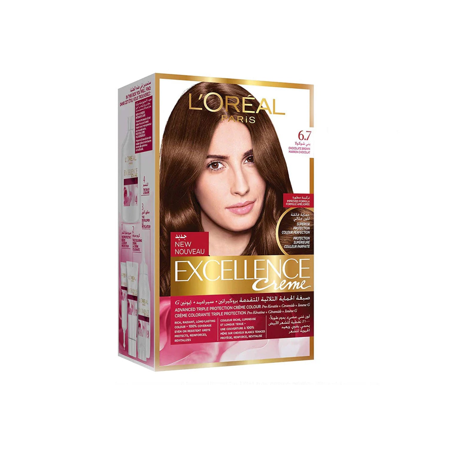 Loreal Paris Excellence Hair Color in Maroon Chocolate 6.7 offers 100% gray coverage and a rich, long-lasting color. Formulated with Pro-Keratin Complex and Ceramide, it strengthens and protects hair while providing a lustrous shine. Achieve a professional-quality hair color at home.