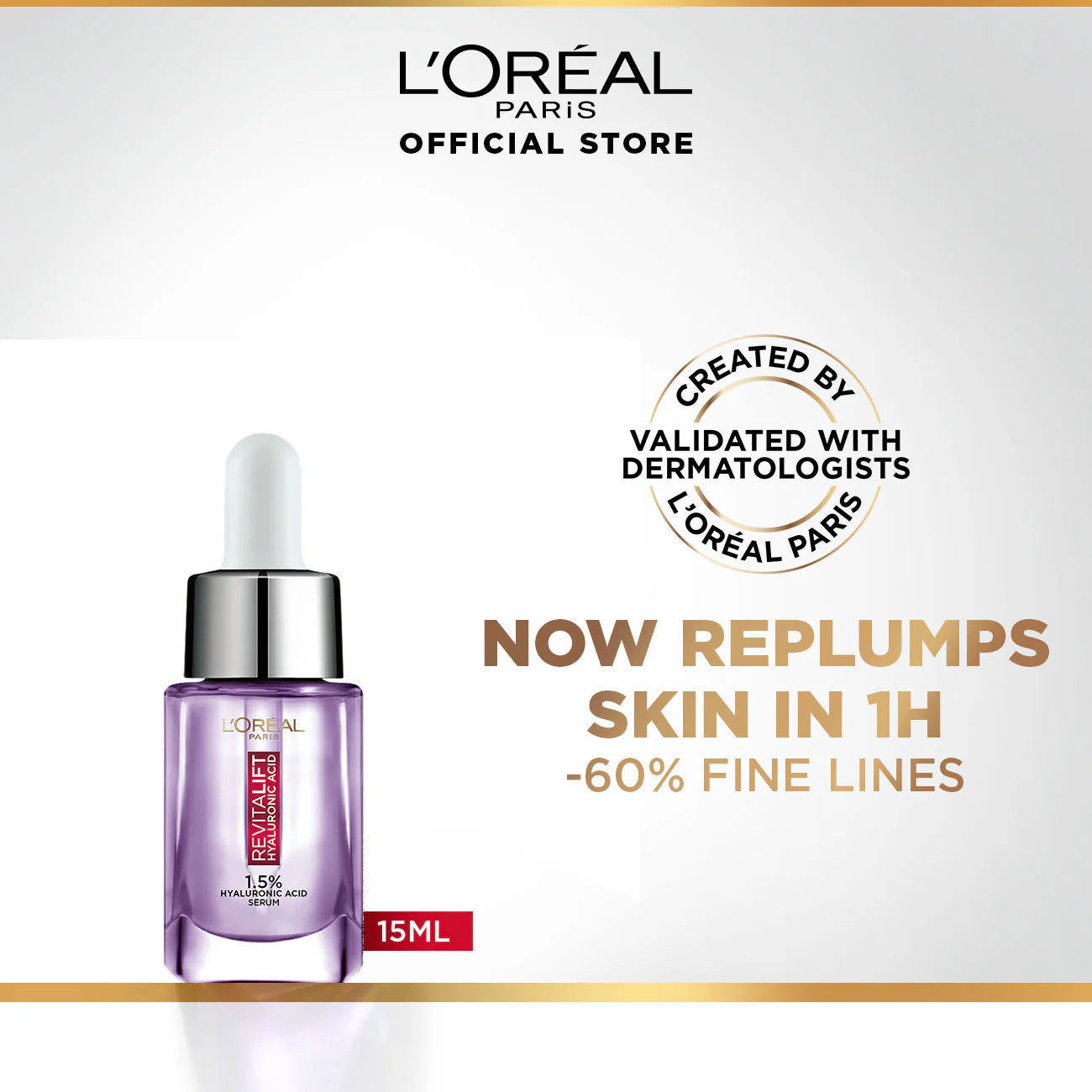 Experience the power of L'Oréal Paris Hyaluronic Acid (HA) serum with our highest concentration* of 1.5%. Hyaluronic Acid plumps up skin (90%*), deeply hydrates (98%+), and boosts radiance (98%+). Patented micro-hyaluronic technology penetrates deeper for immediate results. Dermatologist-tested for visible improvements in plumpness, fine lines, and texture.