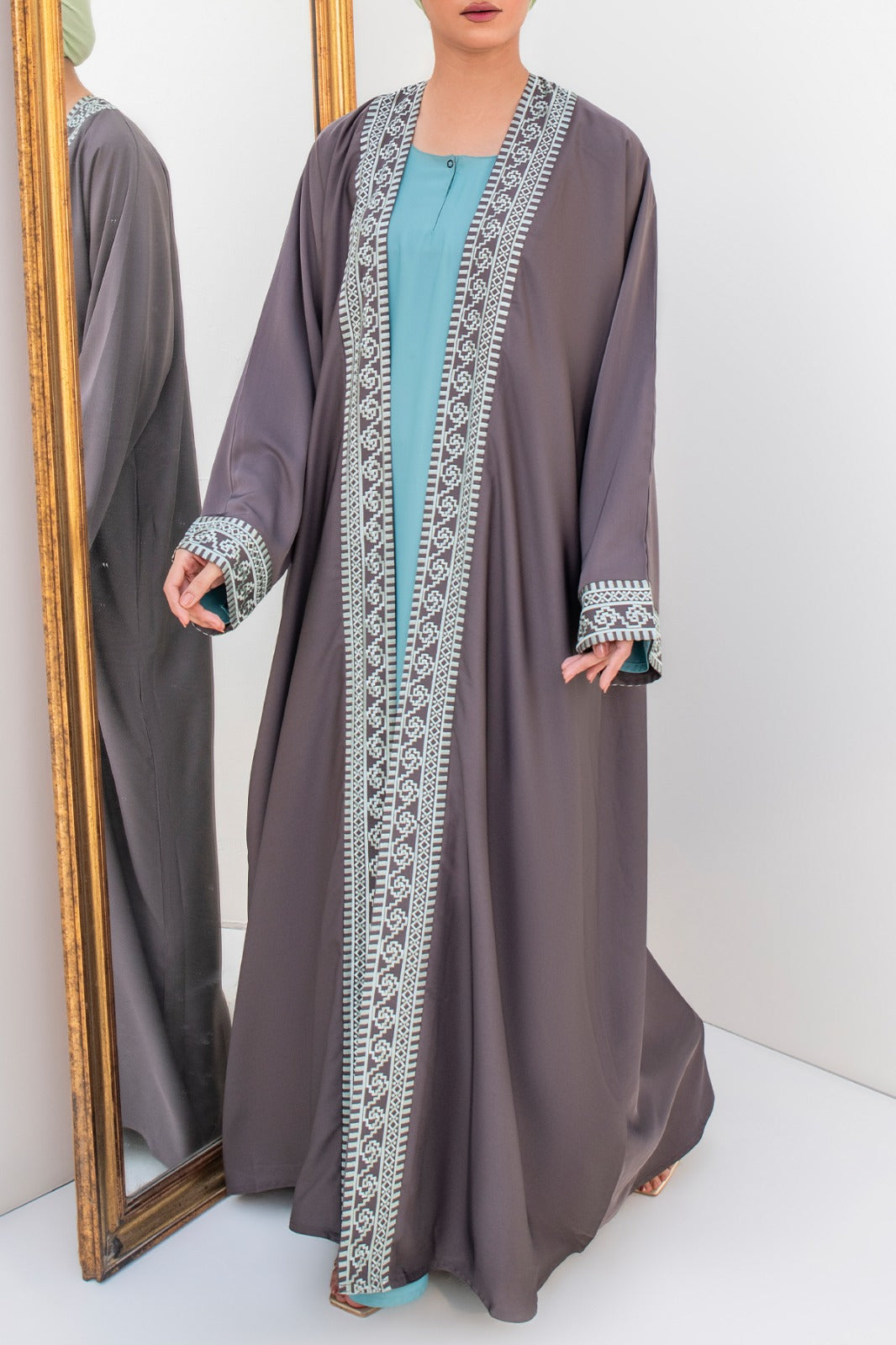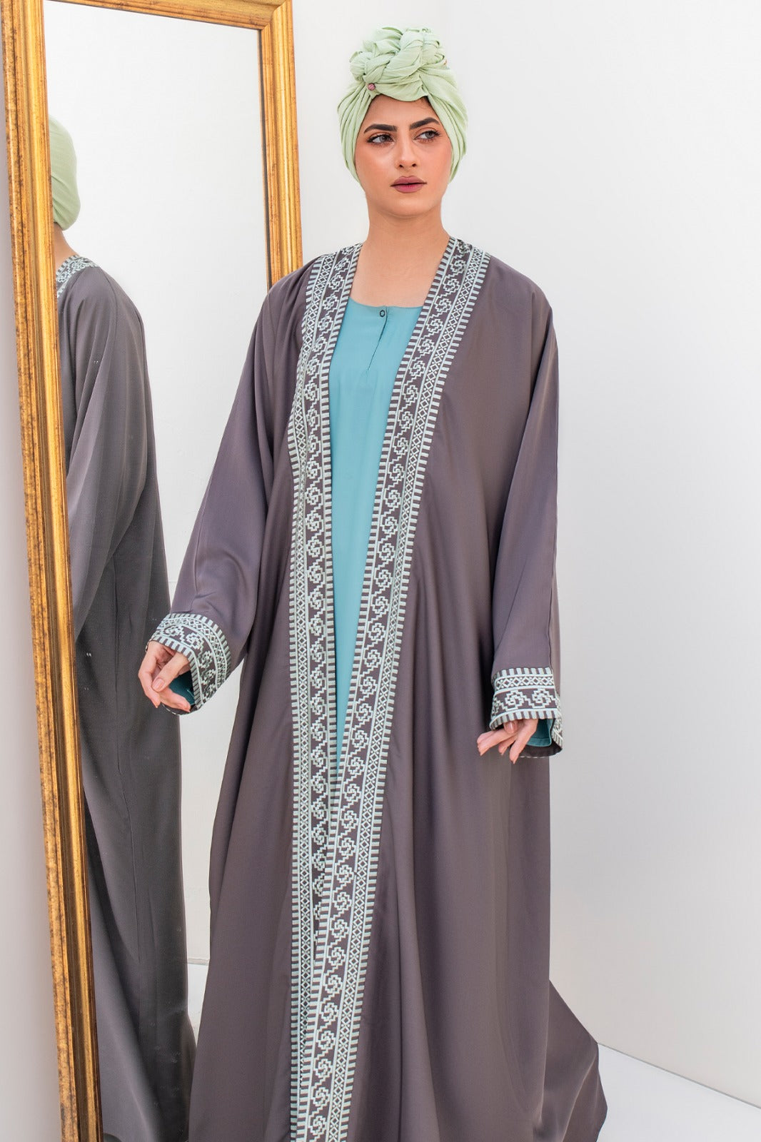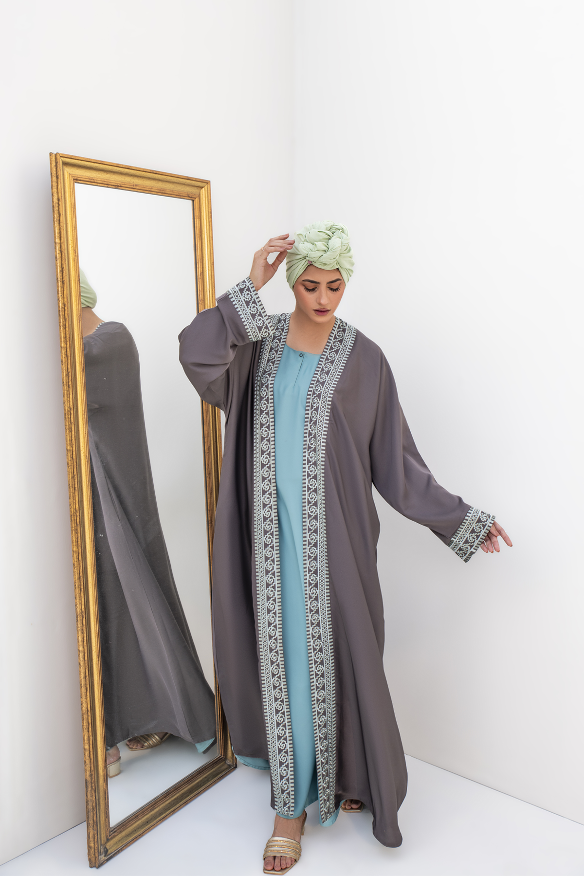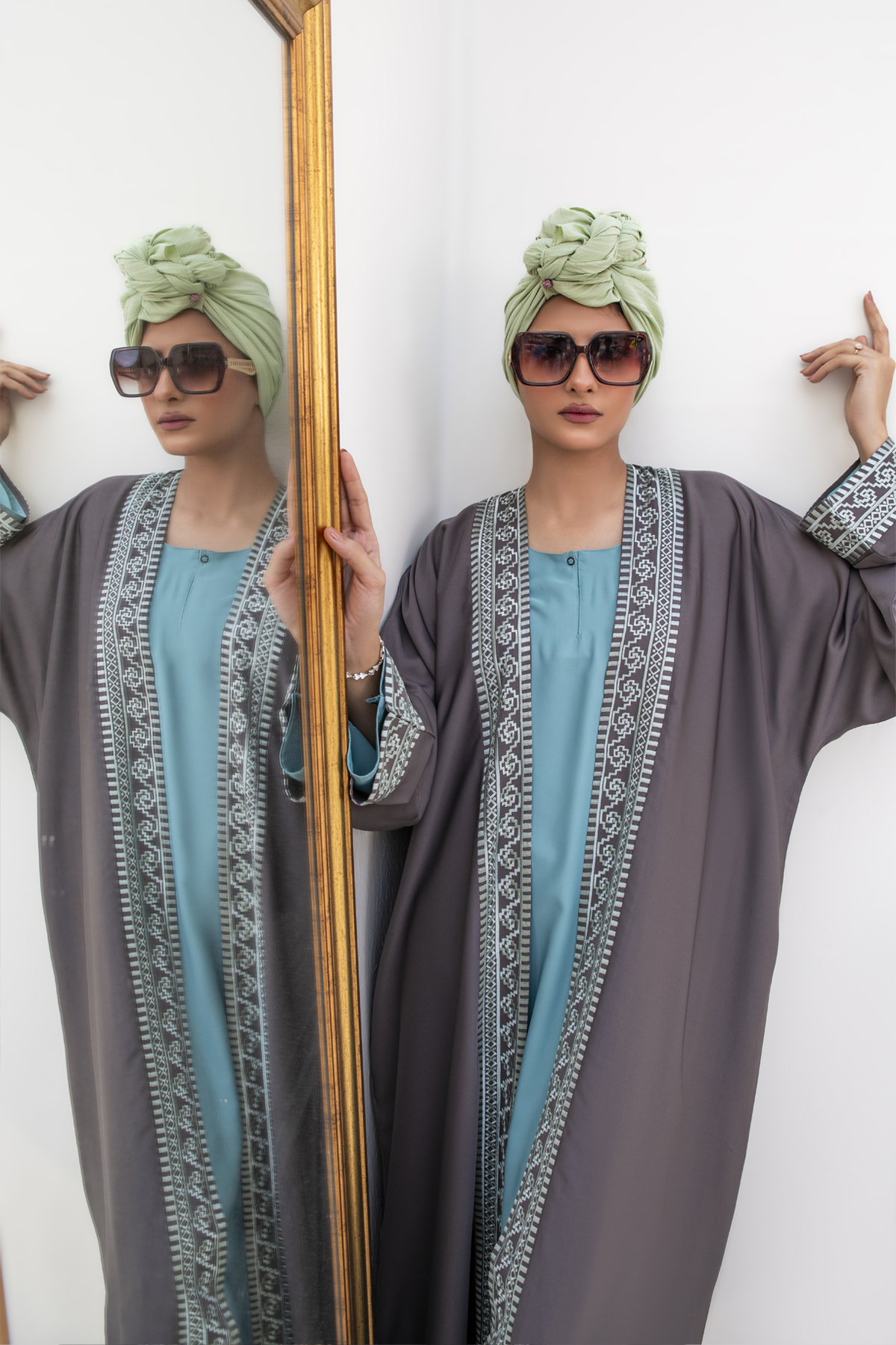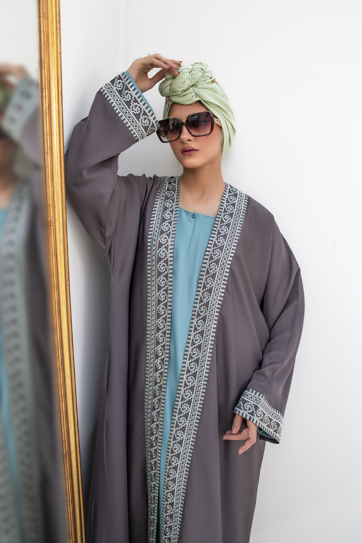 is a beautiful Abaya in shades of Grey, Blue and beautiful green hijab. It's thoughtfully designed with heavy Embroidery in front that hugely complements it giving a very premium look to maintain its elegant fall. This coat style abaya with attached inner, flowy design adds a touch of grace. A retro style Abaya with a modern touch.