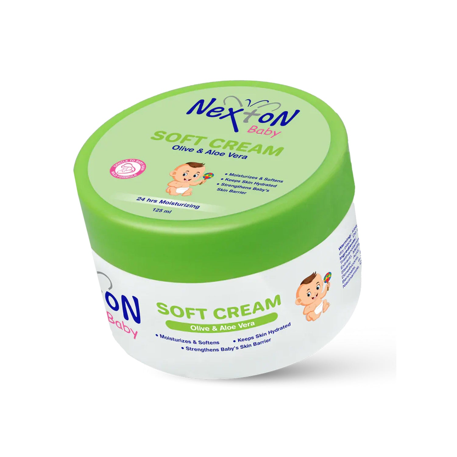 Nexton Baby Soft Cream, enriched with the nourishing properties of Olive Oil and Aloe Vera. This luxurious cream moisturizes and softens delicate skin while keeping it hydrated and strengthening its natural barrier. Give your baby the ultimate pampering experience with Nexton.