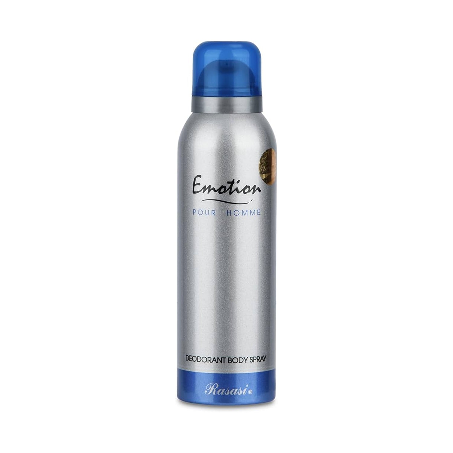 Experience 24-hour protection from perspiration and body odor with Rasasi's Emotion Pour Homme Deodorant Spray for Men. The intense, sensual, and masculine fragrance will make you stand out on any occasion. Its signature scent makes it an ideal gift for men.