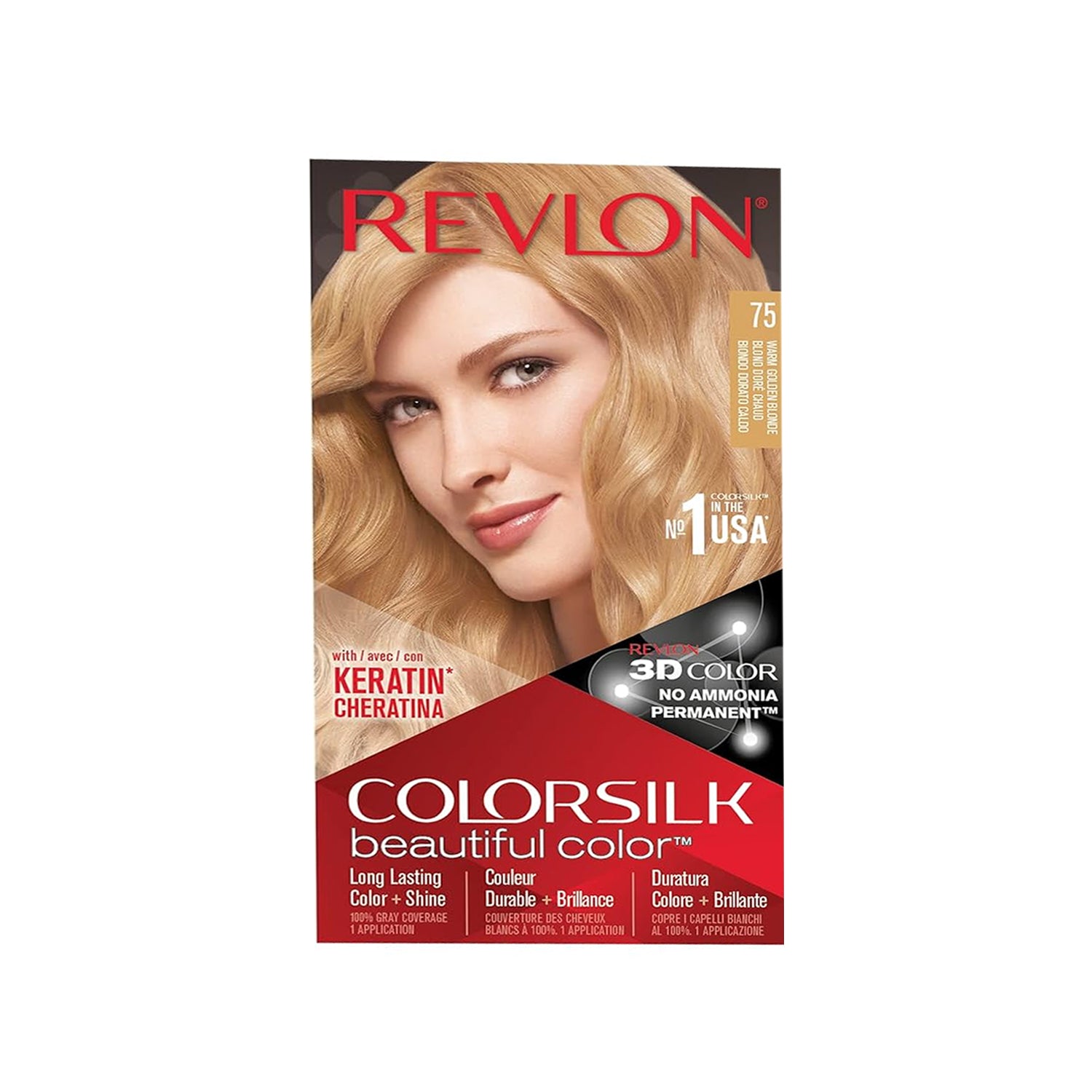 Achieve a warm golden blonde hair color with Revlon ColorSilk in shade 75. This professional-grade hair color is scientifically formulated for optimal results, giving you up to 100% gray coverage and long-lasting color. Get the perfect blend of warmth and radiance for a natural-looking and vibrant blonde.