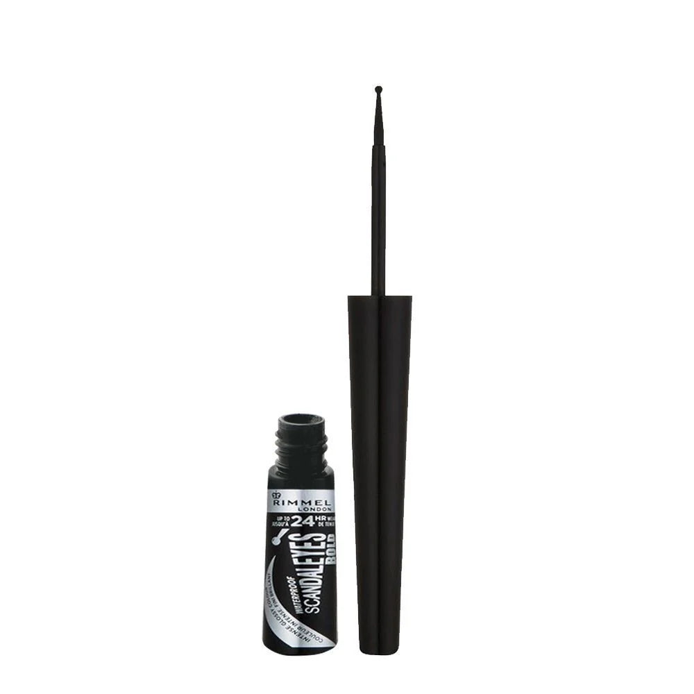 The Rimmel London Scandaleyes Bold Liquid Eyeliner is designed to deliver a striking, dramatic line for an impactful eye look. This liquid eyeliner is formulated to provide intense color payoff and a bold, thick line, creating a statement-making effect. The applicator is typically designed for easy control and precision, allowing for smooth and even application along the lash line. The formula is crafted to be long-wearing and smudge-proof, ensuring that the bold line stays put throughout the day. It's intended to create a scandalous, eye-catching look that enhances the eyes with dramatic definition.