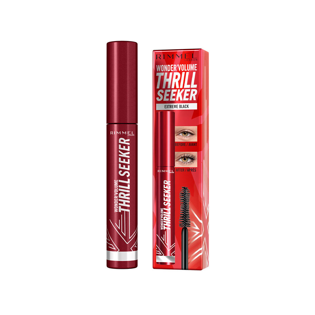 The Rimmel London Wonder Volume Thrill Seeker Mascara in Extreme Black is designed to provide intense volume and a lifted lash effect for a bold, dramatic look. This mascara aims to deliver noticeable thickness and length, creating an eye-catching appearance. The "Thrill Seeker" aspect emphasizes its ability to create a daring and impactful lash look.