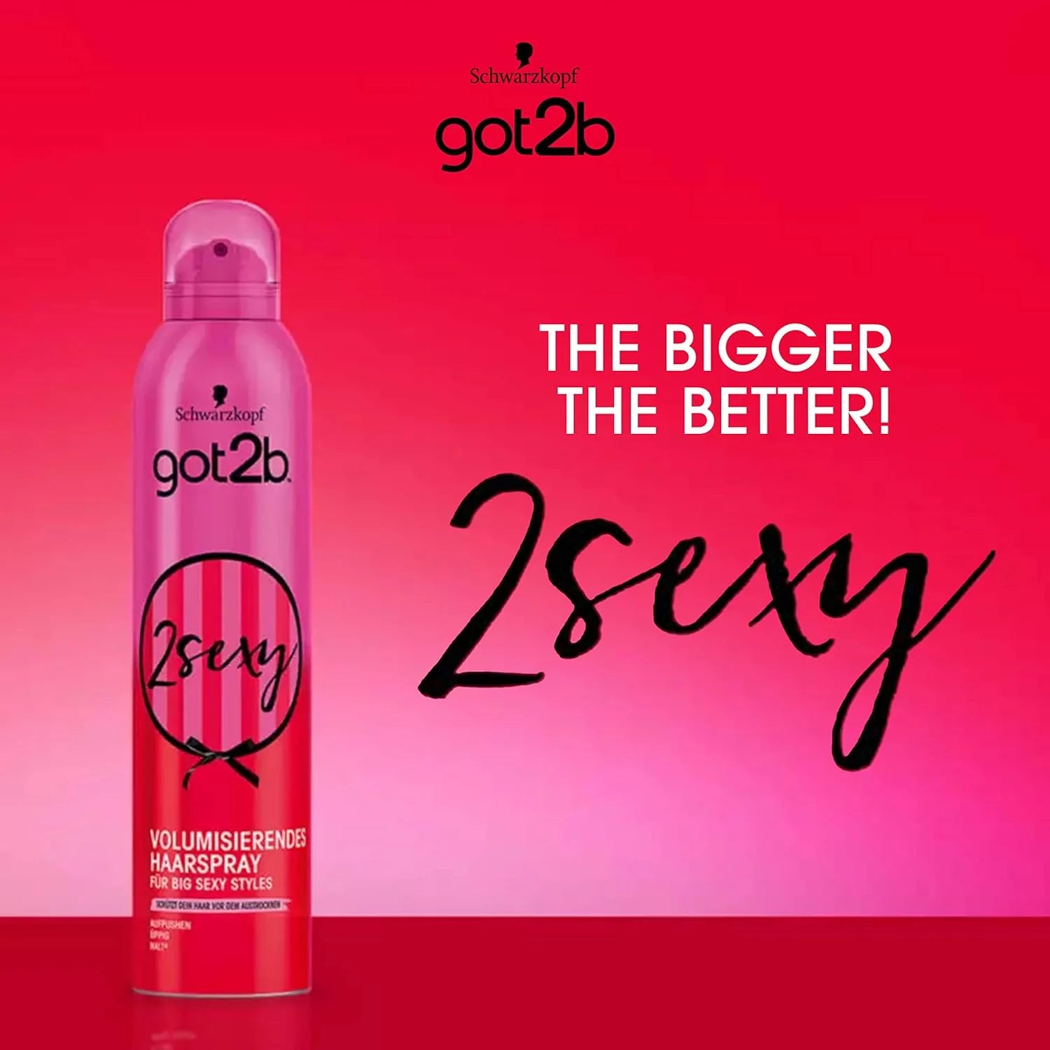 Achieve irresistibly sexy hair with Schwarzkopf Got2b Hairspray 2Sexy Big Volume. This powerful volumizing hairspray adds instant volume and protects your hair from dryness, ensuring a stunning, long-lasting look. Simply spray generously from 30 cm away for extra lush styles that last. Perfect for creating bold, voluminous hair with hold and shine, it’s the ultimate styling product for full-bodied, sexy hair.