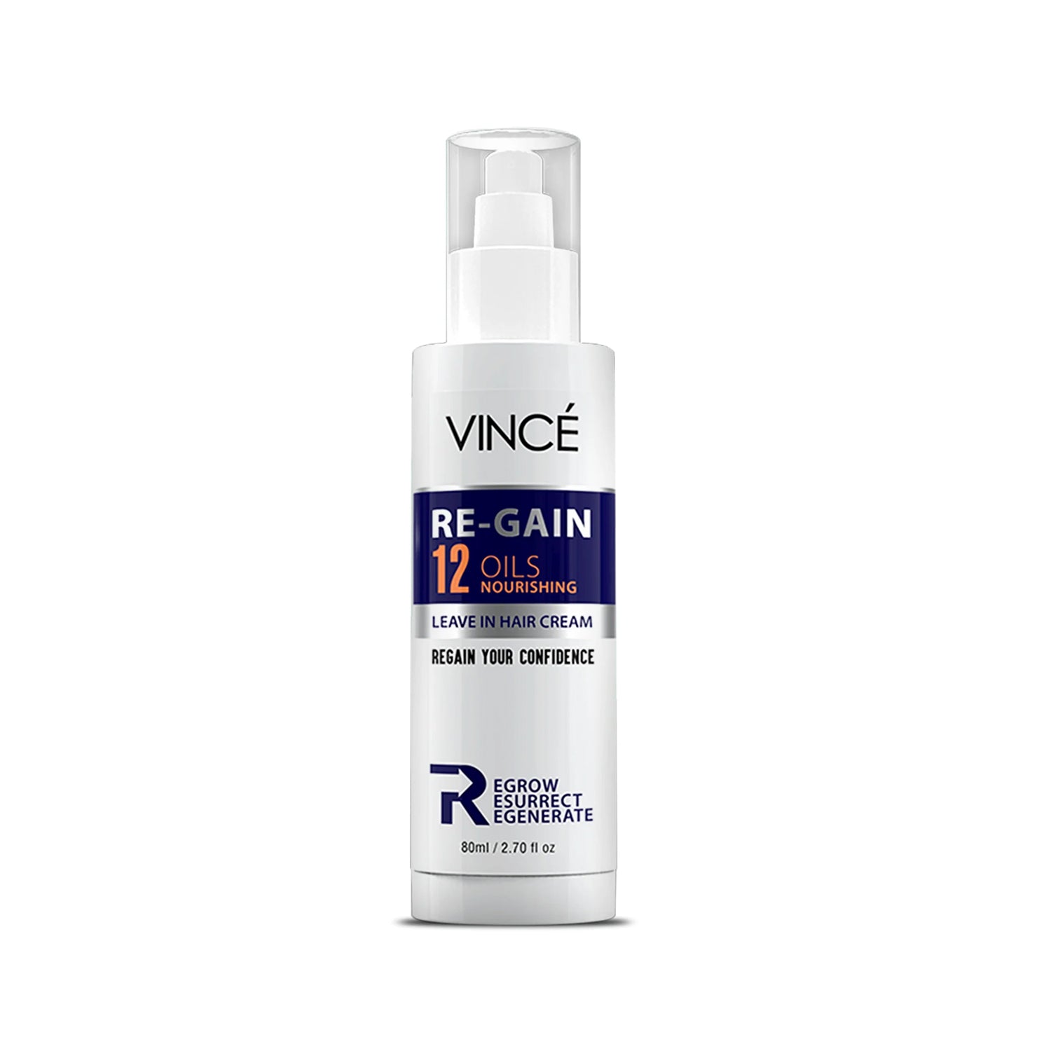 Strengthen and revitalize your hair with Vince - Re-Gain Leave-In Hair Cream for Hair Growth, Scalp Nourishment & Shine. Enriched with a powerful blend of 12 natural oils, including Onion Oil, Tea Tree Oil, and Argan Oil, this lightweight cream promotes hair growth, nourishes the scalp, and enhances hair strength. Designed for daily use, it prevents greasiness, leaving hair resilient, smooth, and shiny without weighing it down. Perfect for repairing weak, thinning hair, it helps restore vitality and protects against environmental stress.