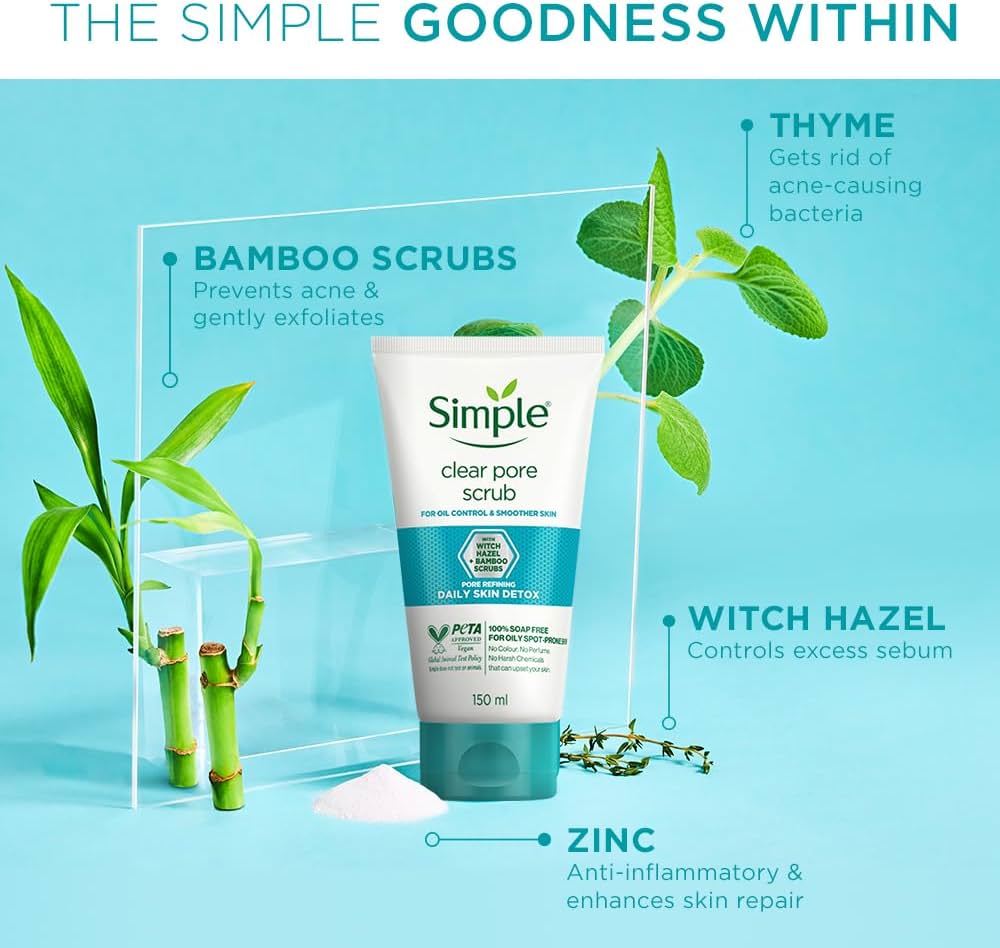 Simple Clear Pore Scrub is your go-to gentle exfoliating cleanser that targets acne-prone and oily skin without irritation. Enriched with witch hazel, zinc, and thyme, it helps unclog pores, absorb oil, and reduce shine while soothing sensitive skin.