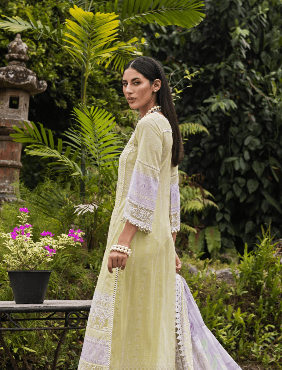 A pastel fantasy ‘Poppy Bliss’ is crafted from the shades of apple green, adorned with embroideries on neckline and borders on hemline. The cool breezy chiffon dupatta blooms a sea of flowers in a dreamy print, this exemplary look won’t ever become unfashionable.
