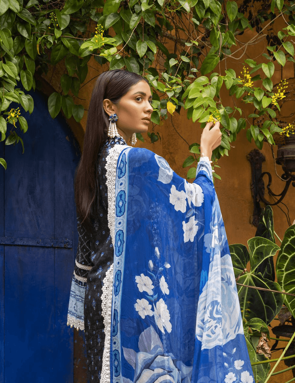 Wild lily offers a youthful tale in the shades of ice blue, which features intricately, rendered embroideries on a cool blue canvas. A classically elegant look is combined with breezy printed chiffon dupatta and pants with embroidered border, which serves as a perfect choice for this summer season.