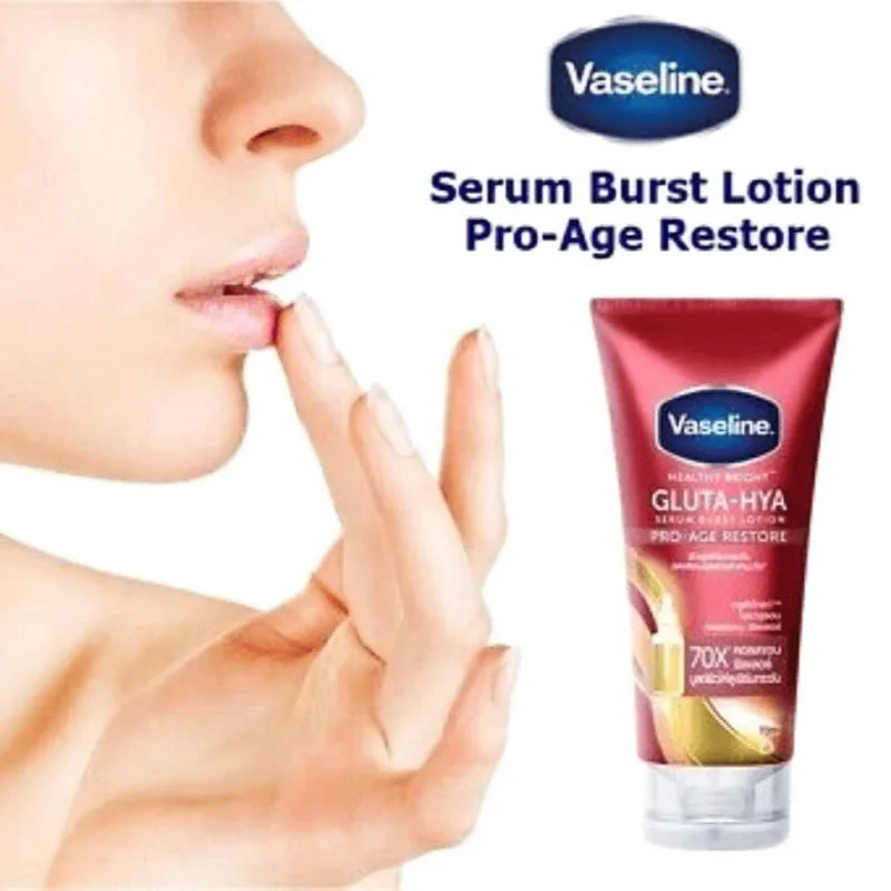 Vaseline Gluta-Hya Pro-Age Restore - Intensive Skin Rejuvenation and Hydration , Size 200 ml , ( Pack Of 1 ). Vaseline Healthy Bright Gluta-Hya Serum Burst Lotion Pro-Age Restore, which smooths and firms skin while reducing age spots.Experience the ultimate skin rejuvenation with Vaseline Gluta-Hya Pro-Age Restore, a powerful formula designed to restore your skin's youthful vitality. This advanced skincare solution combines the nourishing benefits of Glutathione and Hyaluronic Acid to deeply hydrate, revitalize, and smooth your complexion.Address the signs of aging early on with the power of high performing ingredients. This unique formula bursts into water droplets and is instantly absorbed deep into your skin cells. Experience skin that is smoother, firmer and even-toned. How To Apply: Apply the lotion twice a day all over your body.