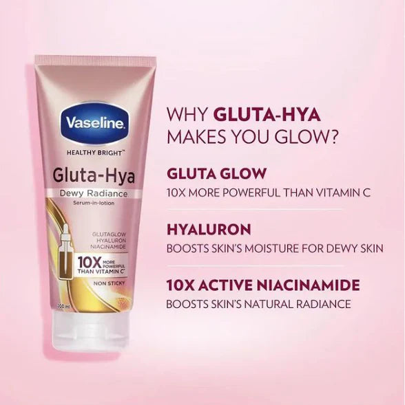 Achieve a youthful, glowing complexion with Vaseline Healthy Bright Gluta-Hya Serum Burst Lotion, powered by GlutaGlow, 10x more effective than Vitamin C. This lightweight formula brightens and evens skin tone, while hyaluronic acid locks in intense moisture for all-day hydration. It absorbs quickly, leaving your skin with a dewy radiance. Perfect for daily use, it protects your skin from pollutants and provides deep moisturization for soft, supple skin.