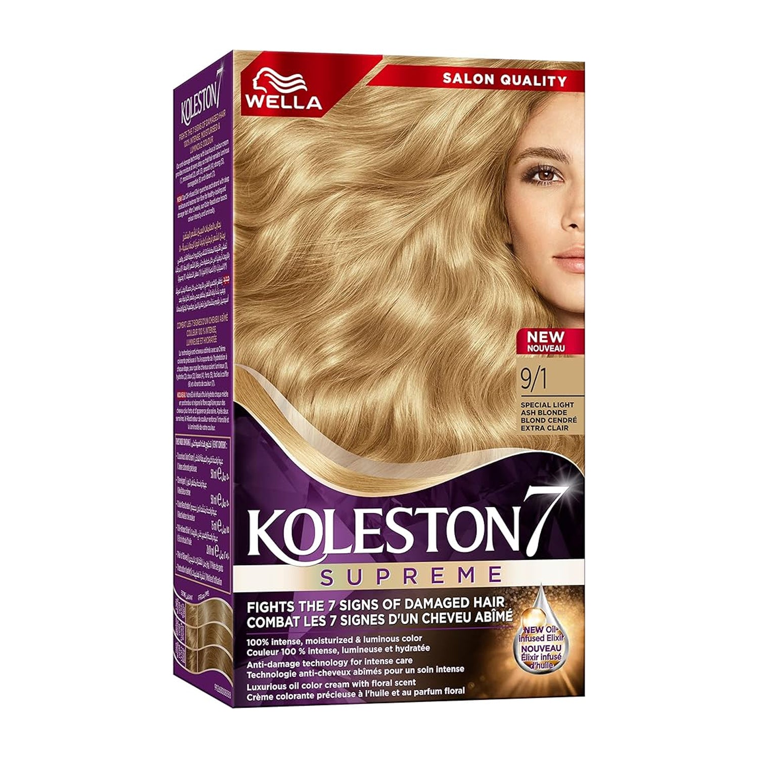 As an expert in hair products, I recommend the Wella Koleston 7 Supreme Hair Dye 9/1 Special Light Ash Blonde for its innovative formula that provides complete gray coverage, deep hydration, and intense color result with a radiant shine. This color cream has a patented formula to prevent damage and boost the seven signs of healthy hair. The package also includes a conditioning treatment and a color enhancer for vibrant, luminous hair.